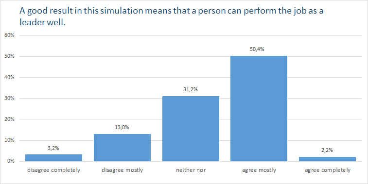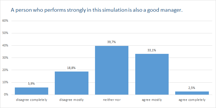 Regarding the question “Success in the management simulation = success as a manager?”, the participants mostly think that a good result in the management simulation also means that the person can successfully manage the tasks of a manager.