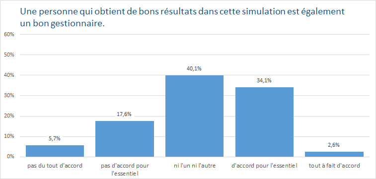 En ce qui concerne la question « Réussir dans la simulation de gestion = réussir en tant que cadre dirigeant ? », la majorité des participants estiment qu’un bon résultat dans la simulation de gestion signifie également que la personne est capable de mener à bien les tâches d’un cadre dirigeant.