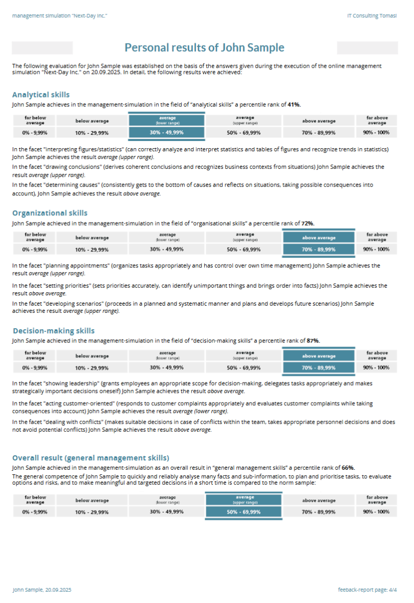 La simulation de gestion « Next-Day Inc. » est évaluée de manière entièrement automatique. Un rapport de feedback sous forme de document PDF est généré immédiatement après la simulation et mis à disposition dans un espace protégé par mot de passe.